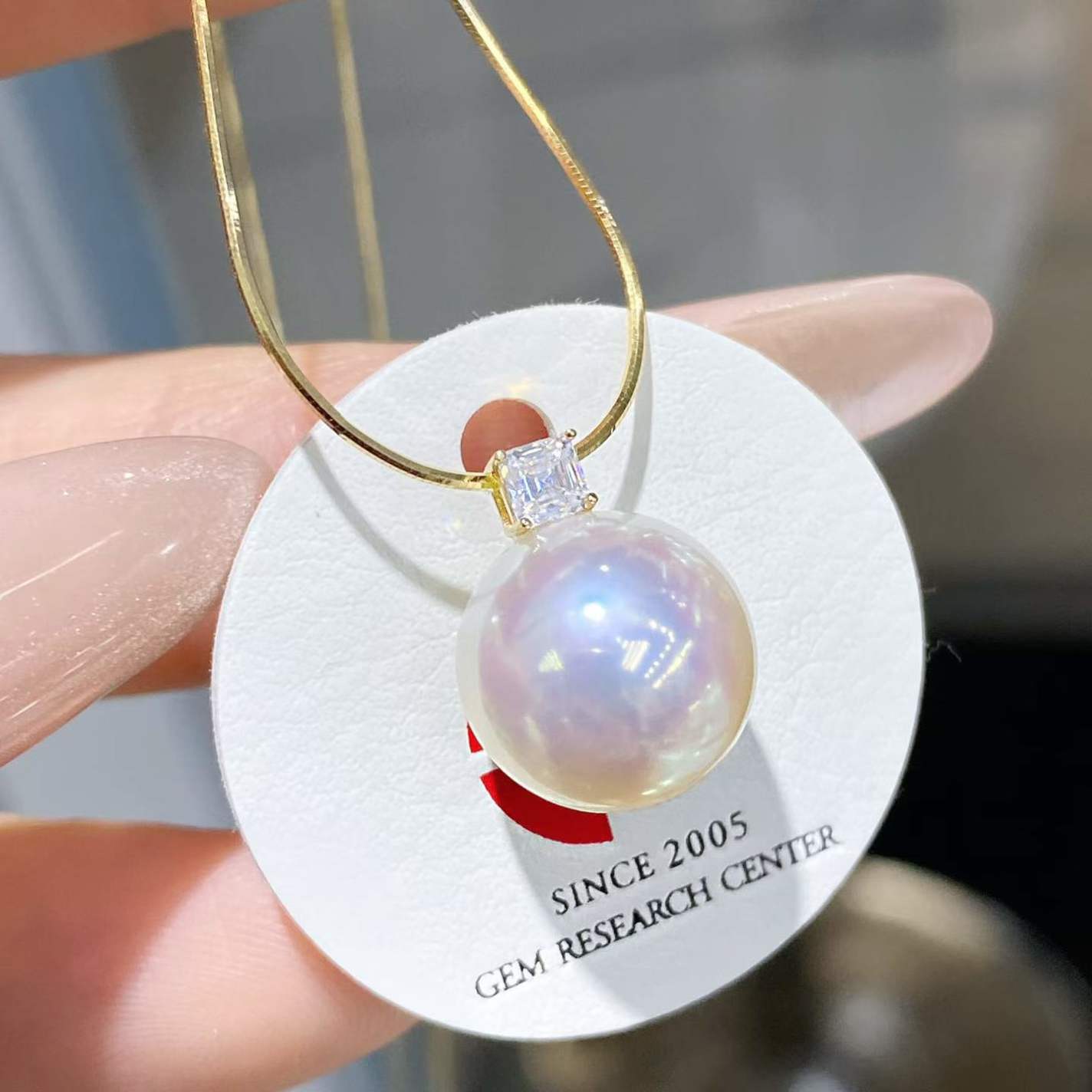Round with light blemishes, soft white-pink luster, delicate and refined — very elegant for everyday wear.