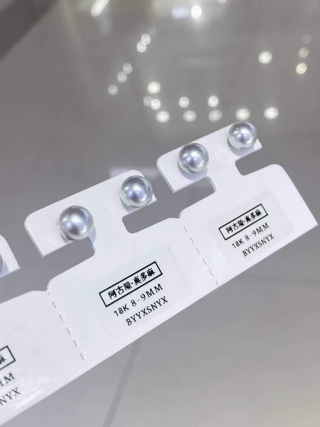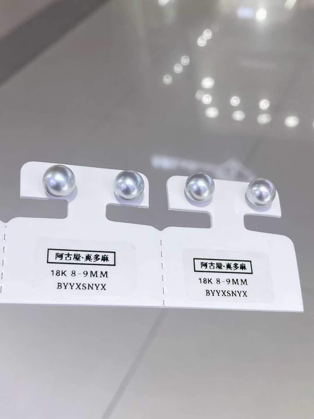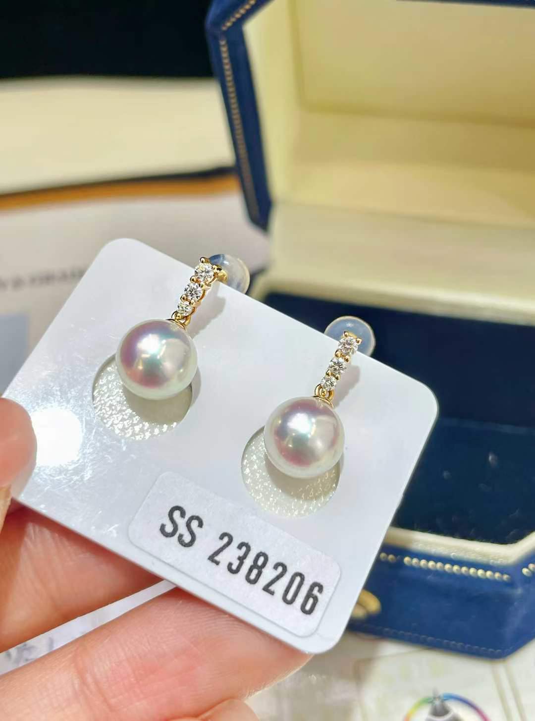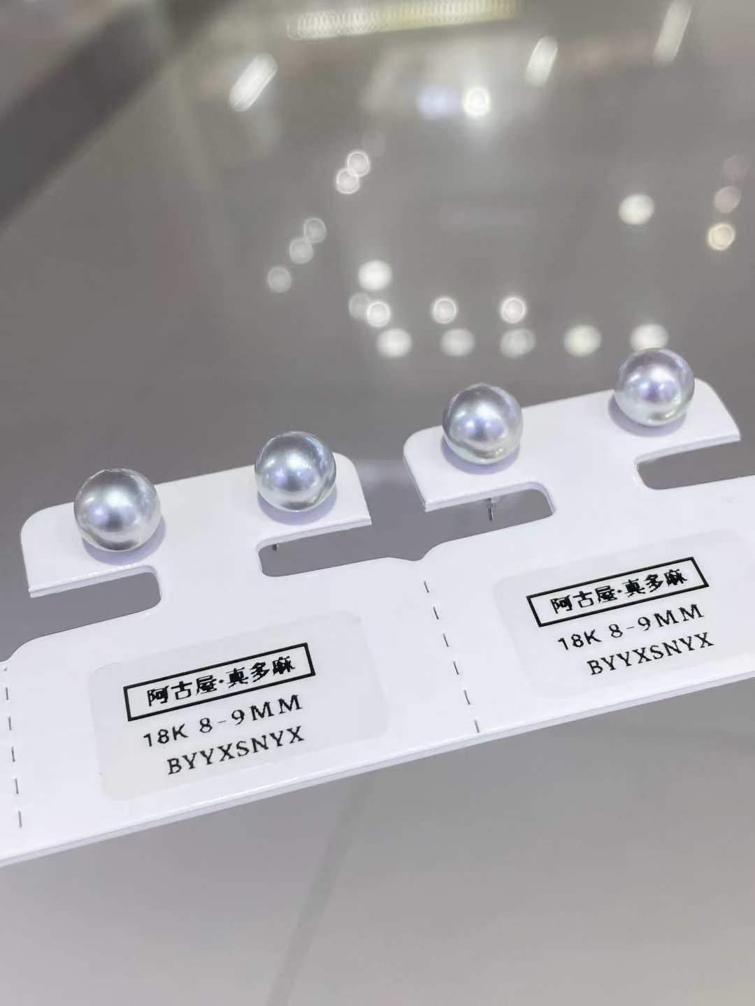 8-9mm saltwater Akoya pearls, round with very very light blemishes, set on 18k white gold posts. Bright, translucent luster with that glowing mermaid-like look. Special price about $124 per pair, basically wholesale pricing.
