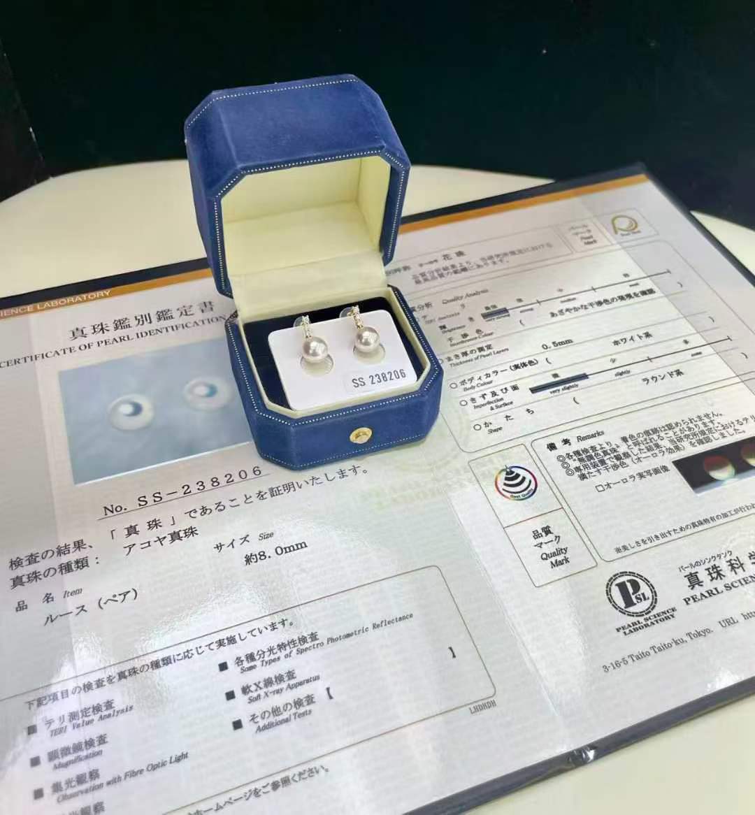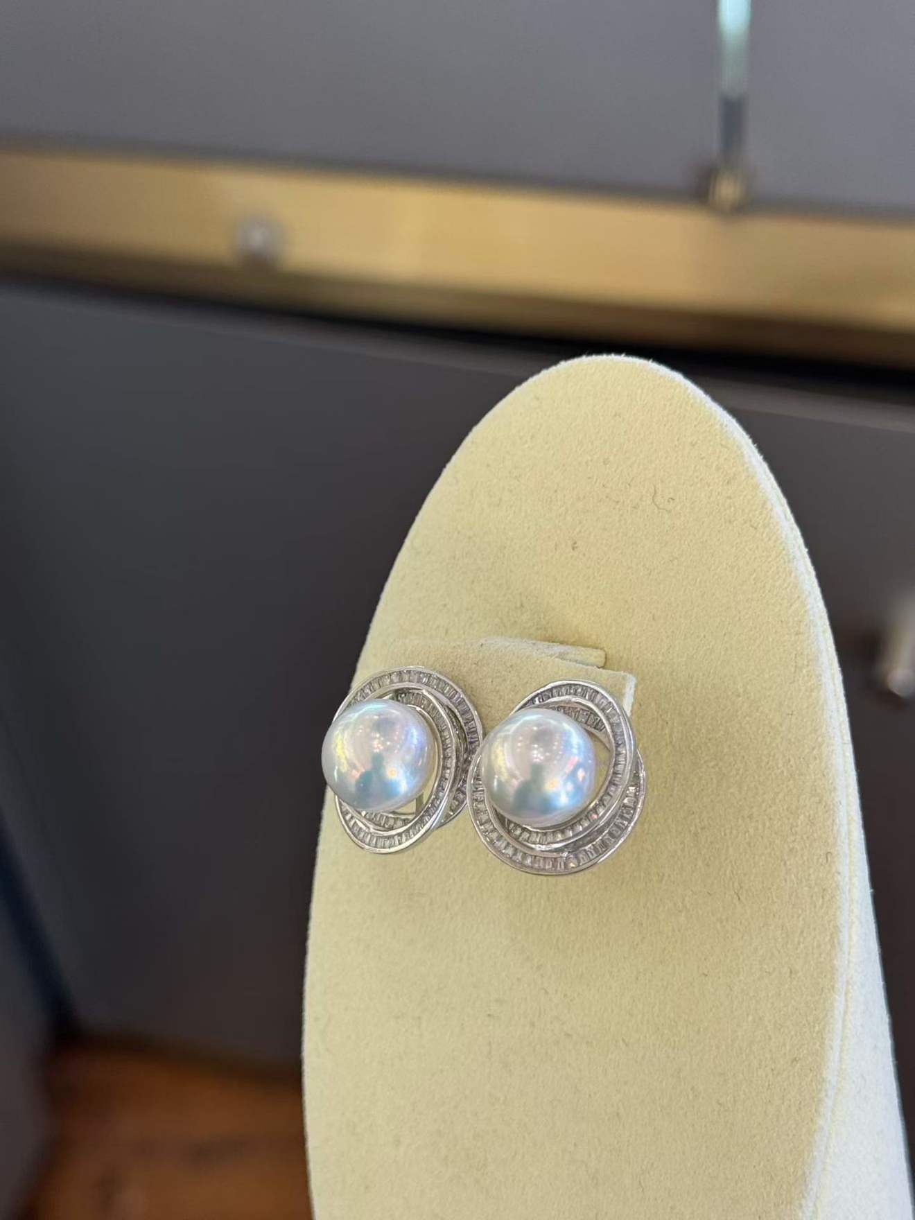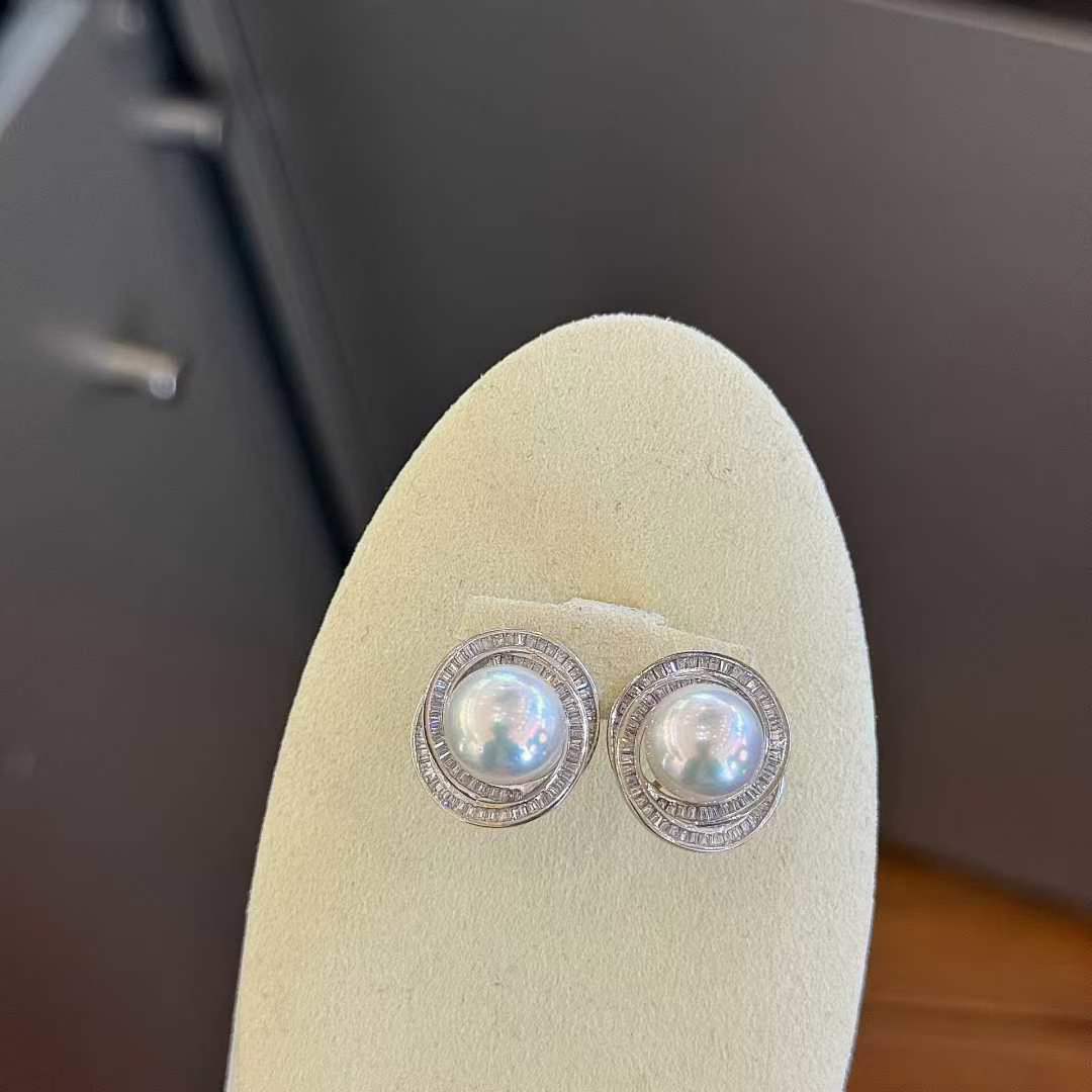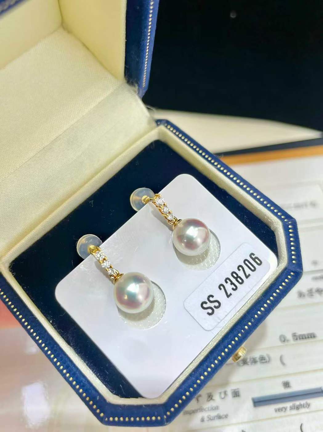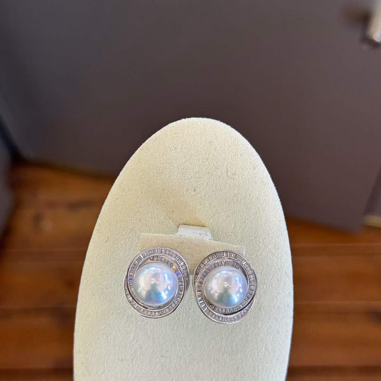 8-9mm saltwater Akoya pearls, round with very very light blemishes, set on 18k white gold posts. Bright, translucent luster with that glowing mermaid-like look. Special price about $124 per pair, basically wholesale pricing.