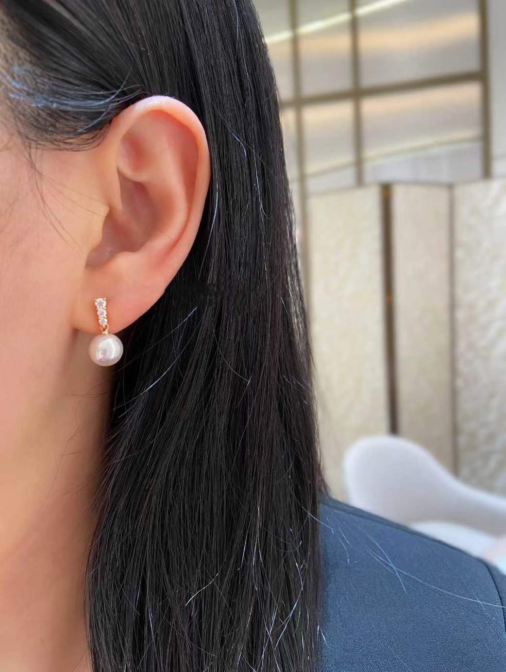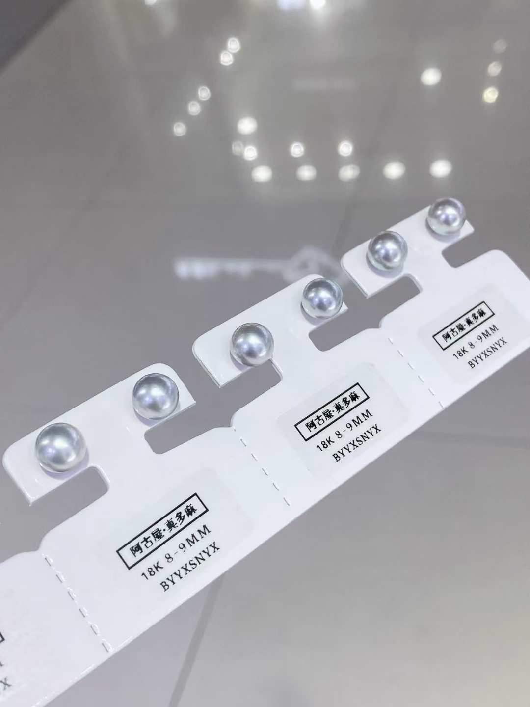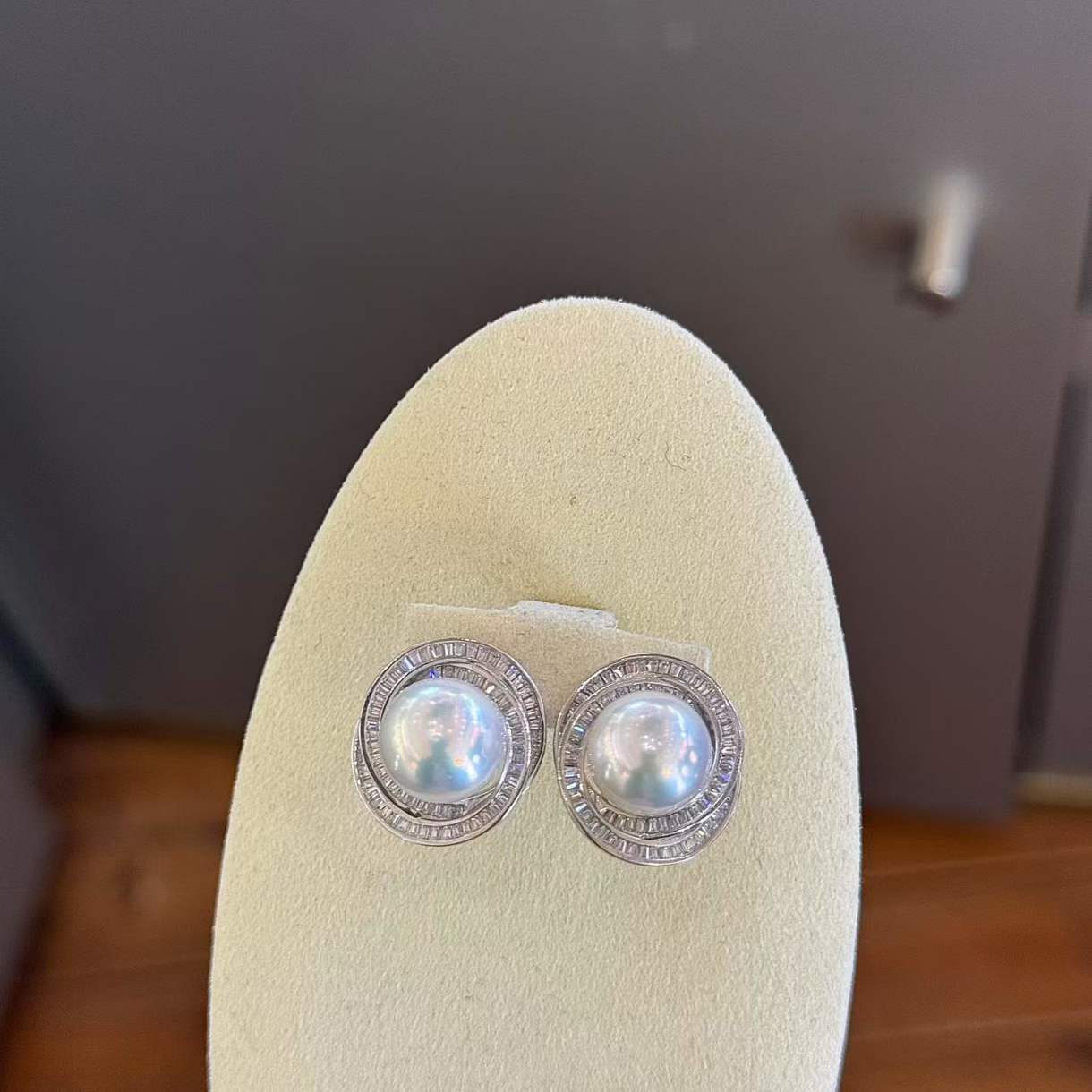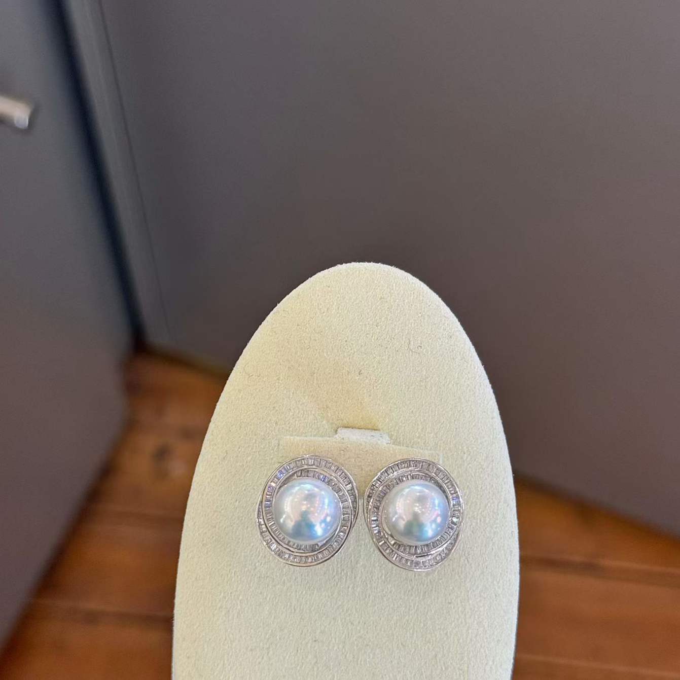 8-9mm saltwater Akoya pearls, round with very very light blemishes, set on 18k white gold posts. Bright, translucent luster with that glowing mermaid-like look. Special price about $124 per pair, basically wholesale pricing.
