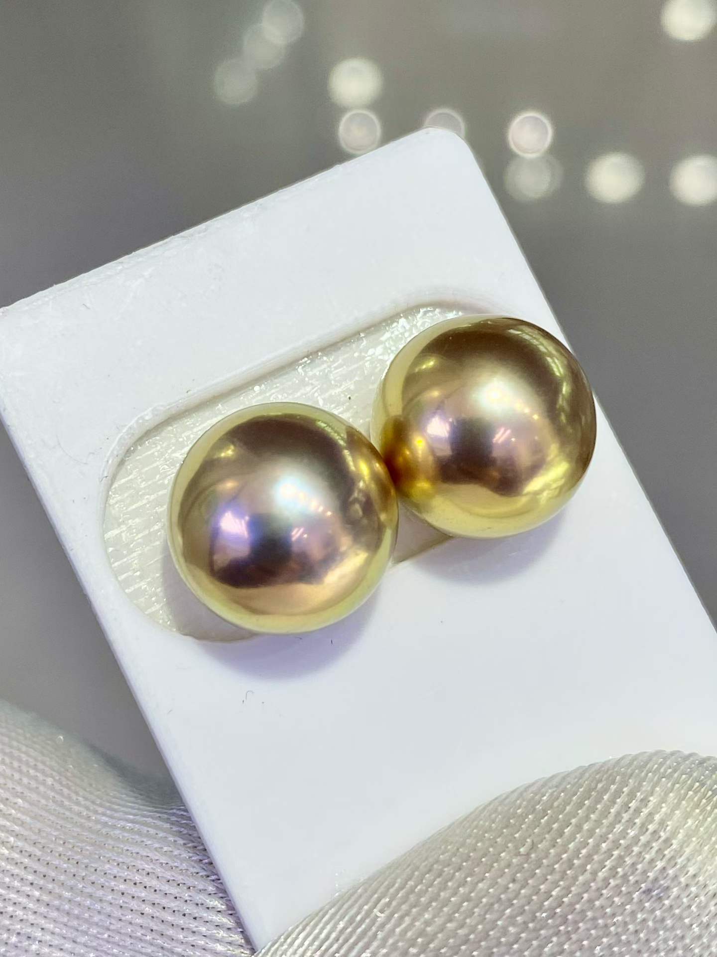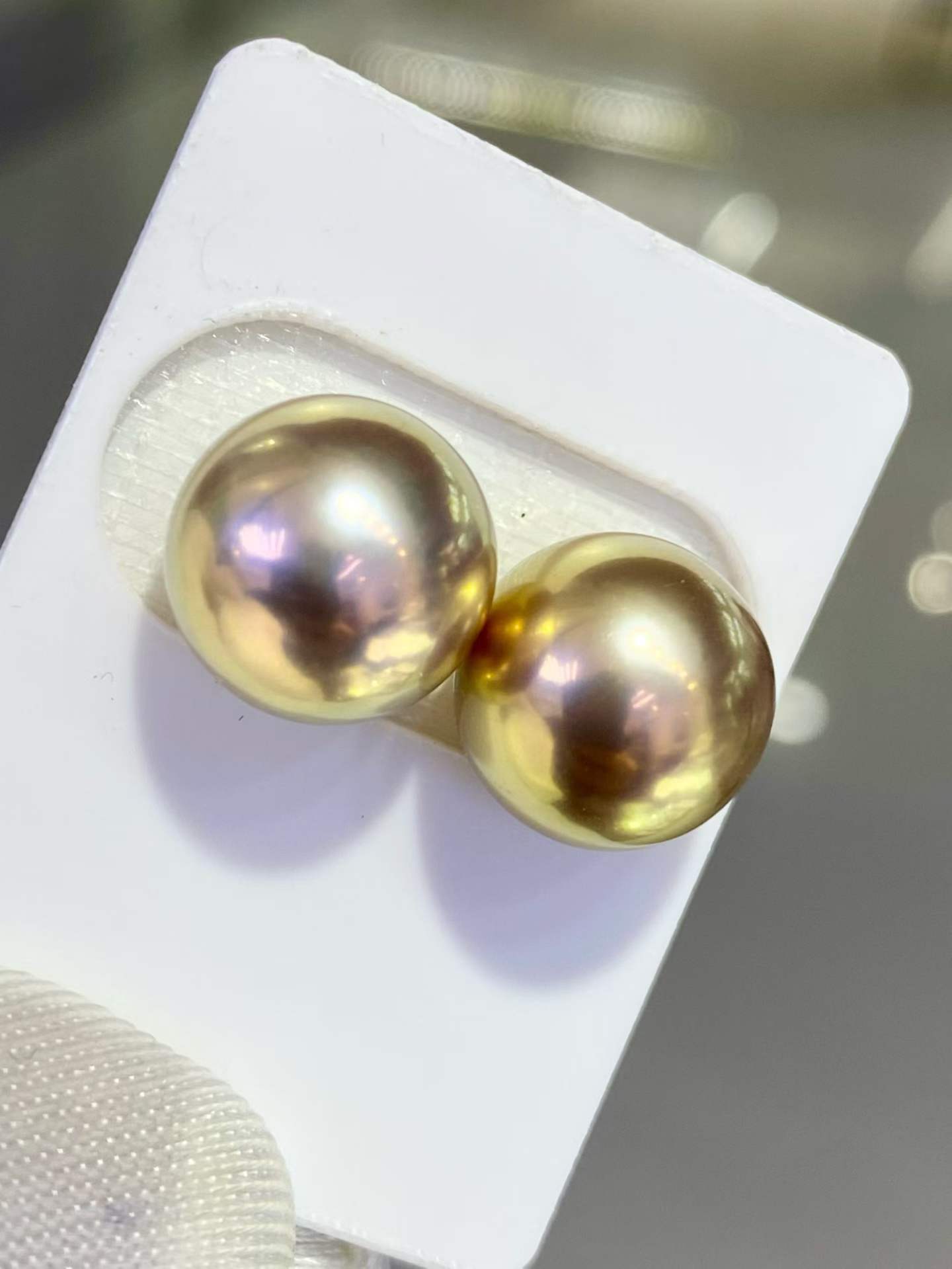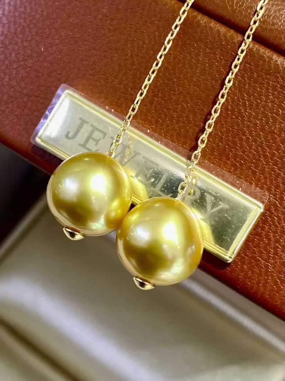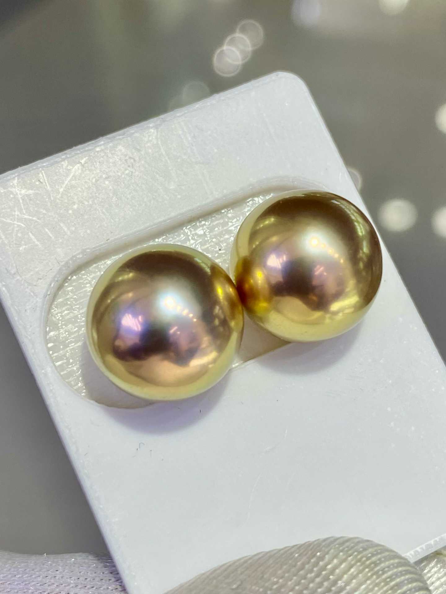 New 13-14mm South Sea golden pearls — bright luster, each one round, clean, and basically flawless. This batch is for custom orders. Pendants, rings, or 18k gold settings are all possible. Large size at a friendly price, about $182+ per pearl, setting not included.
