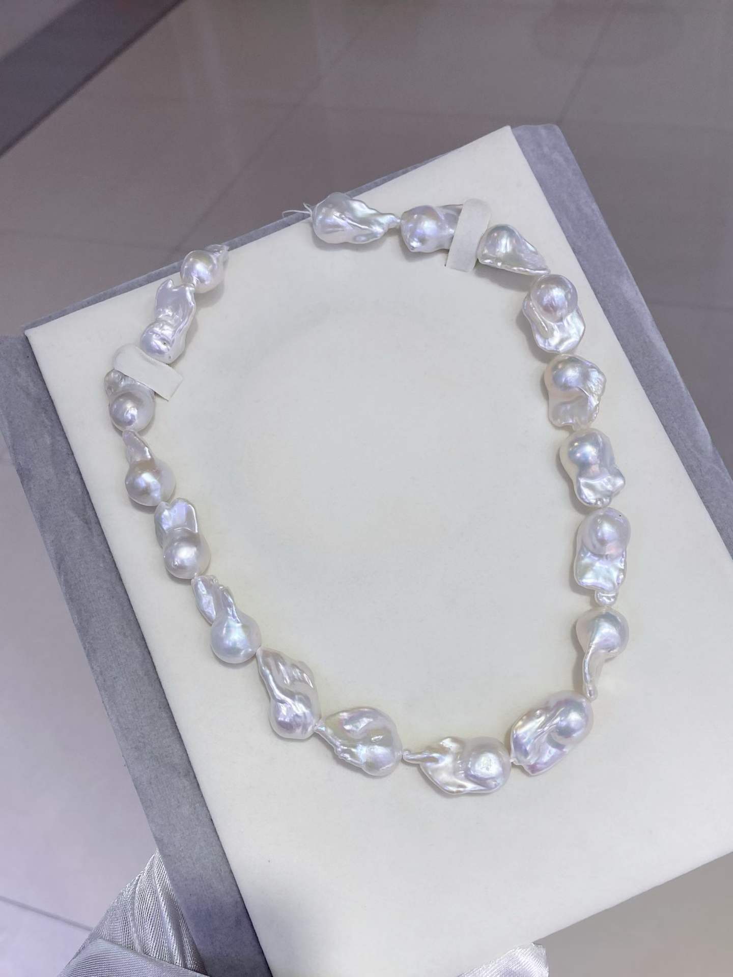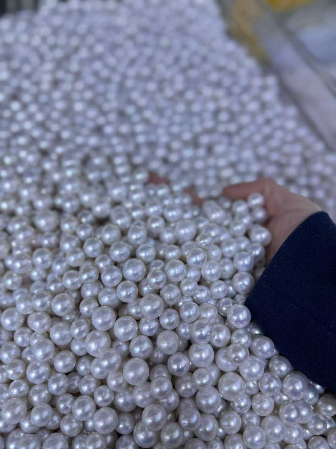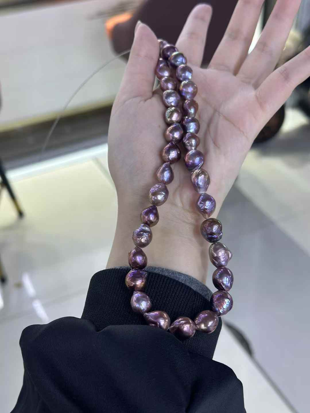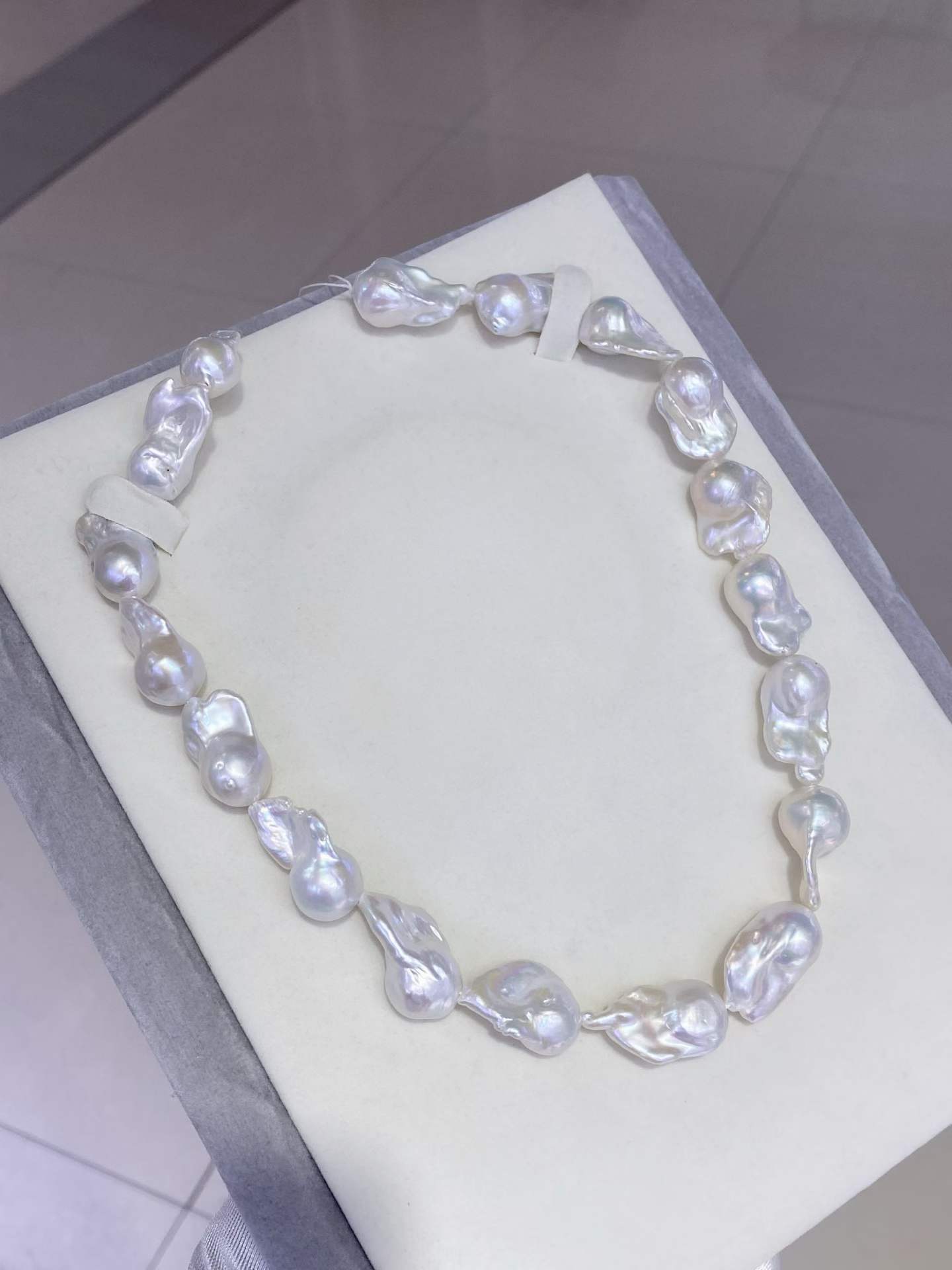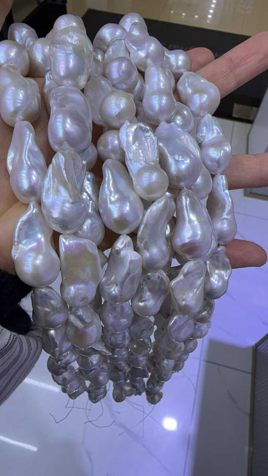 About 12×14mm aurora freshwater baroque pearls with bright white silky luster. Strands like this used to cost well over 1,000 RMB, but this batch is on super special at about $91 — basically the price of one pearl for an entire strand.