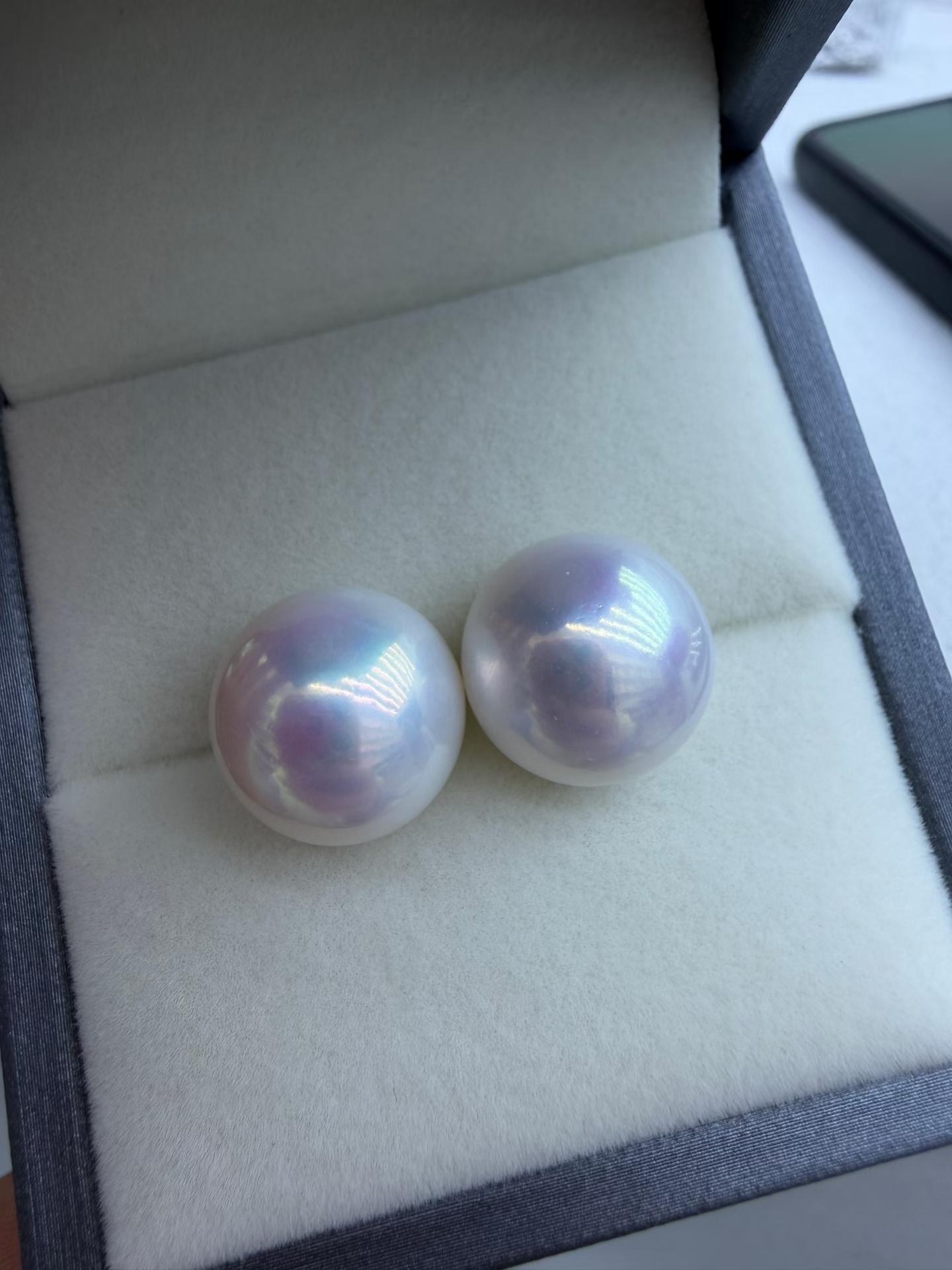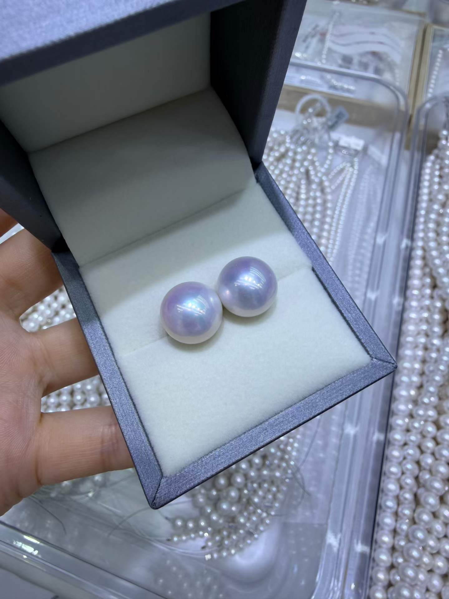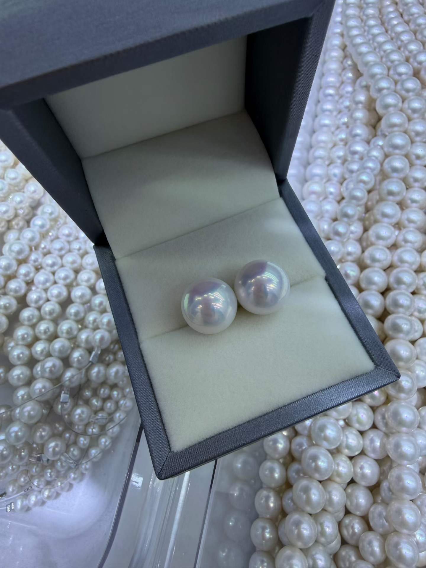 13-14mm freshwater Edison stud earrings with aurora luster, extra-bright mirror shine, gem-like glow, and mermaid tones. Beautiful pink-blue overtone, rare luster in a larger size. Only one pair, about $109 per pair. Overall quite clean with minor blemishes that don’t show. Thick, round, full-bodied, and super lustrous — like tiny glowing bulbs.