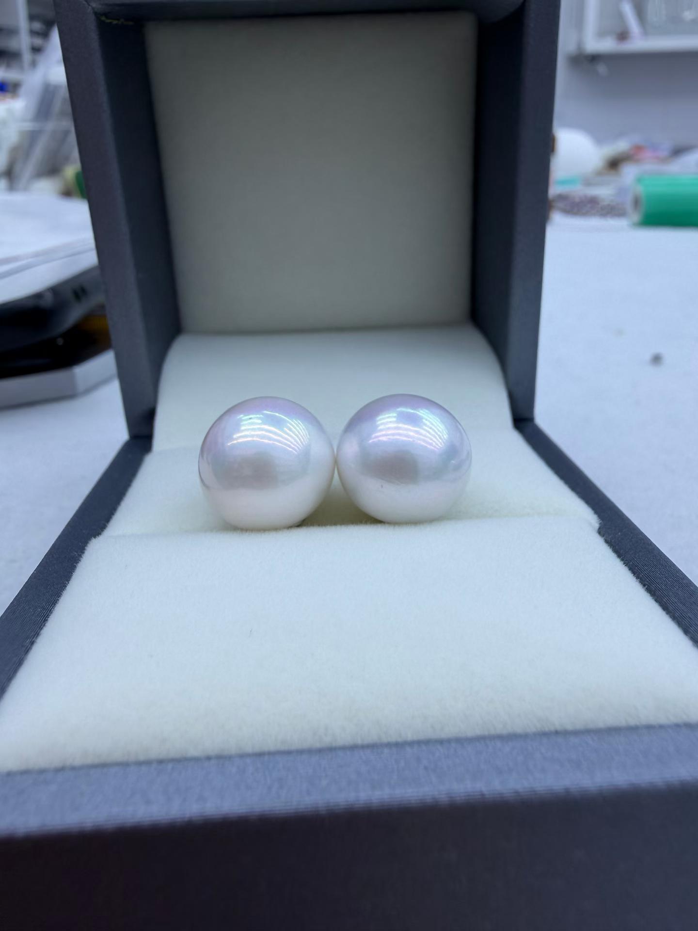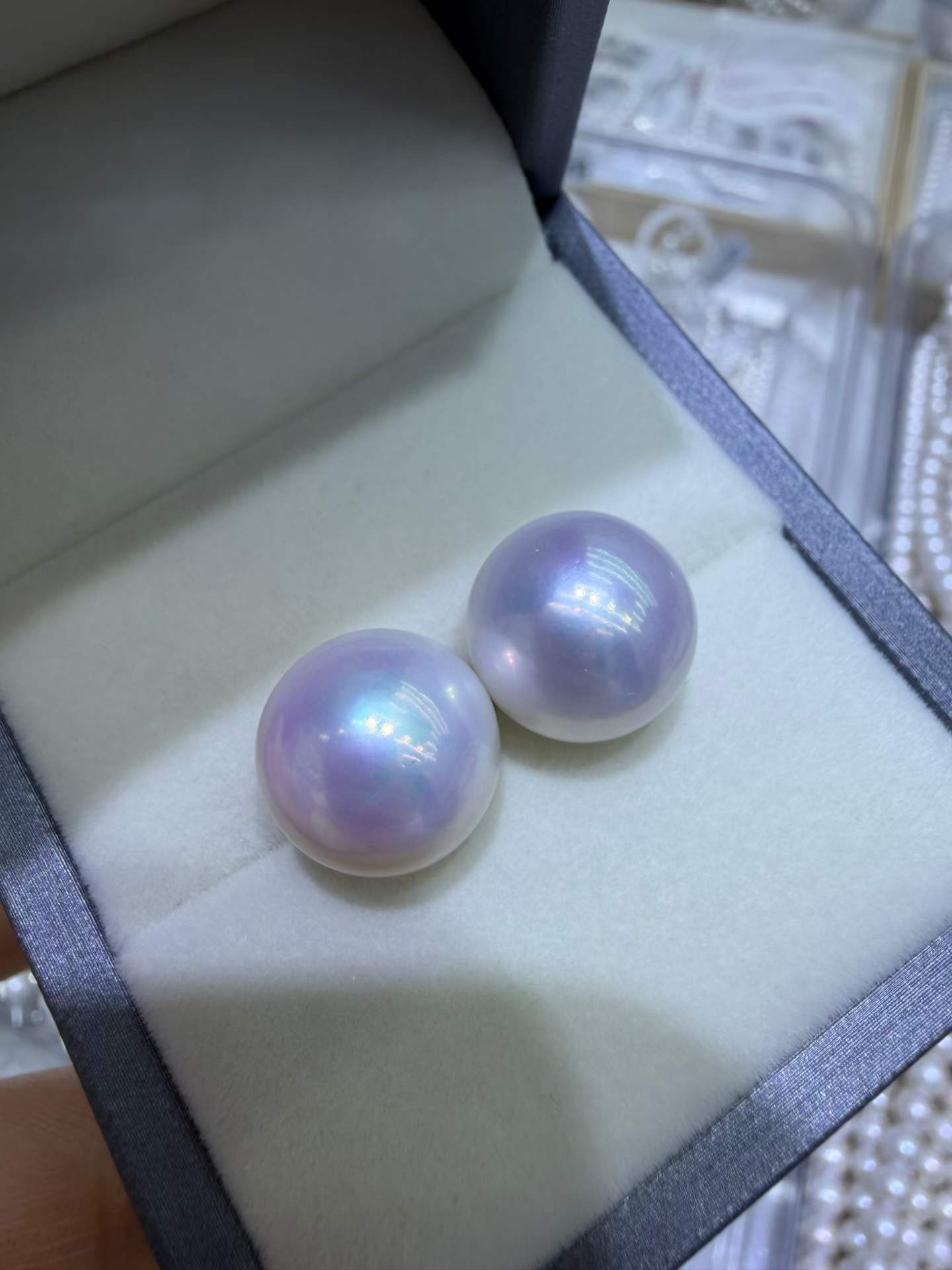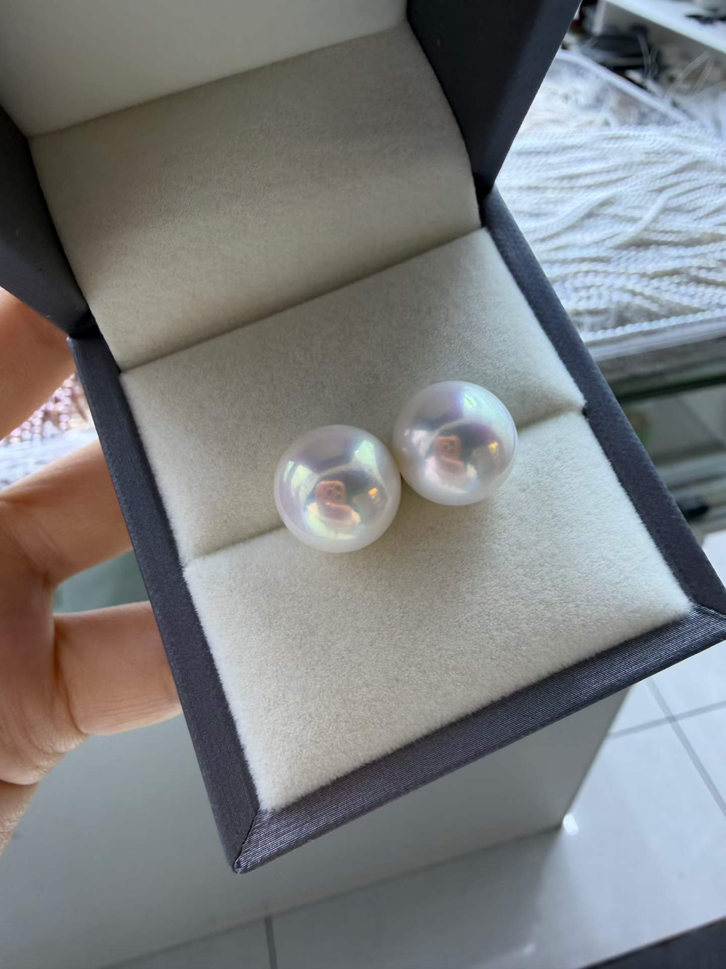 13-14mm freshwater Edison stud earrings with aurora luster, extra-bright mirror shine, gem-like glow, and mermaid tones. Beautiful pink-blue overtone, rare luster in a larger size. Only one pair, about $109 per pair. Overall quite clean with minor blemishes that don’t show. Thick, round, full-bodied, and super lustrous — like tiny glowing bulbs.