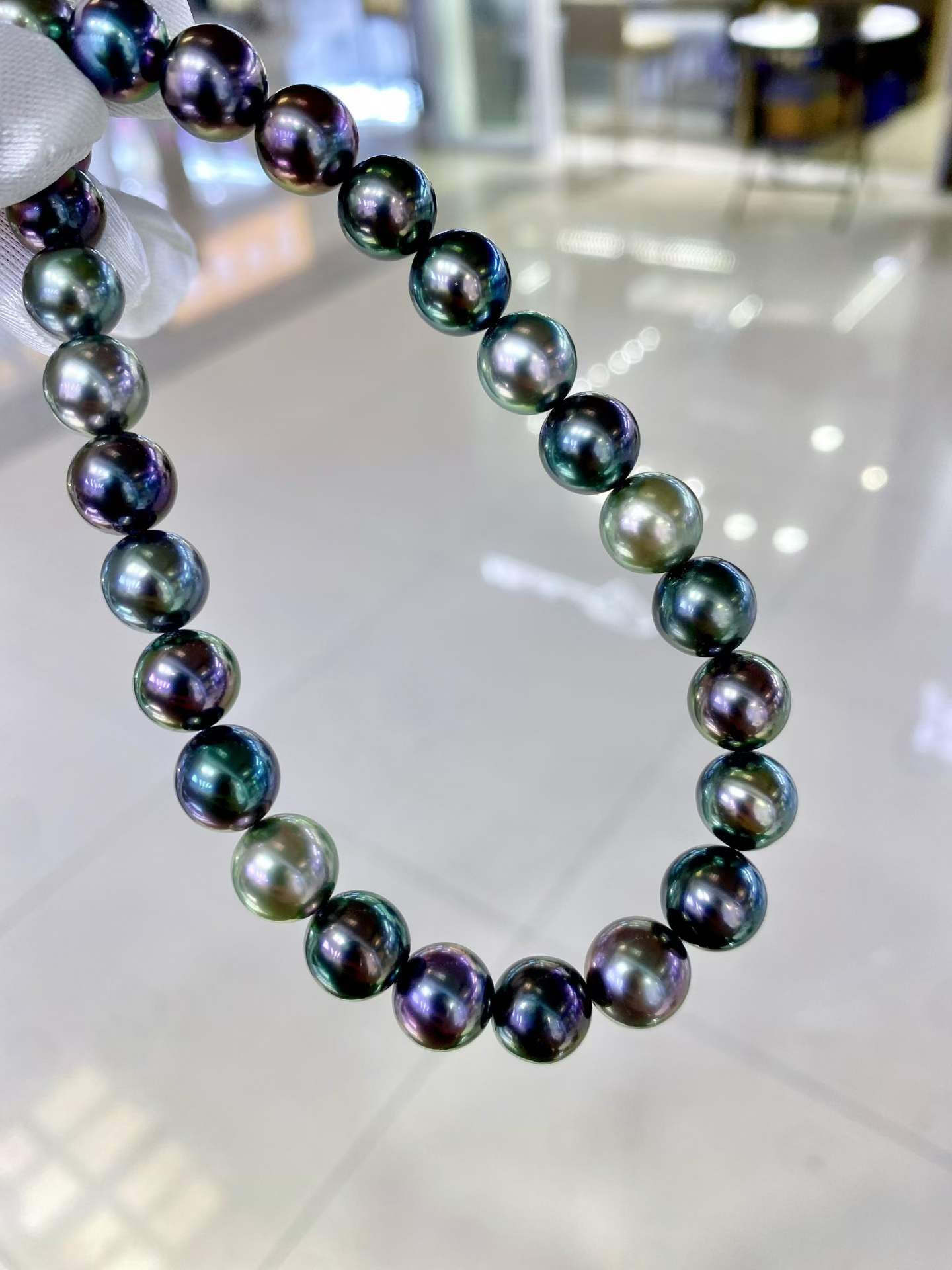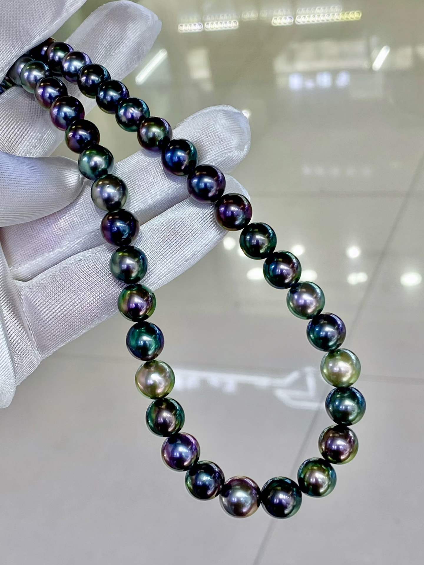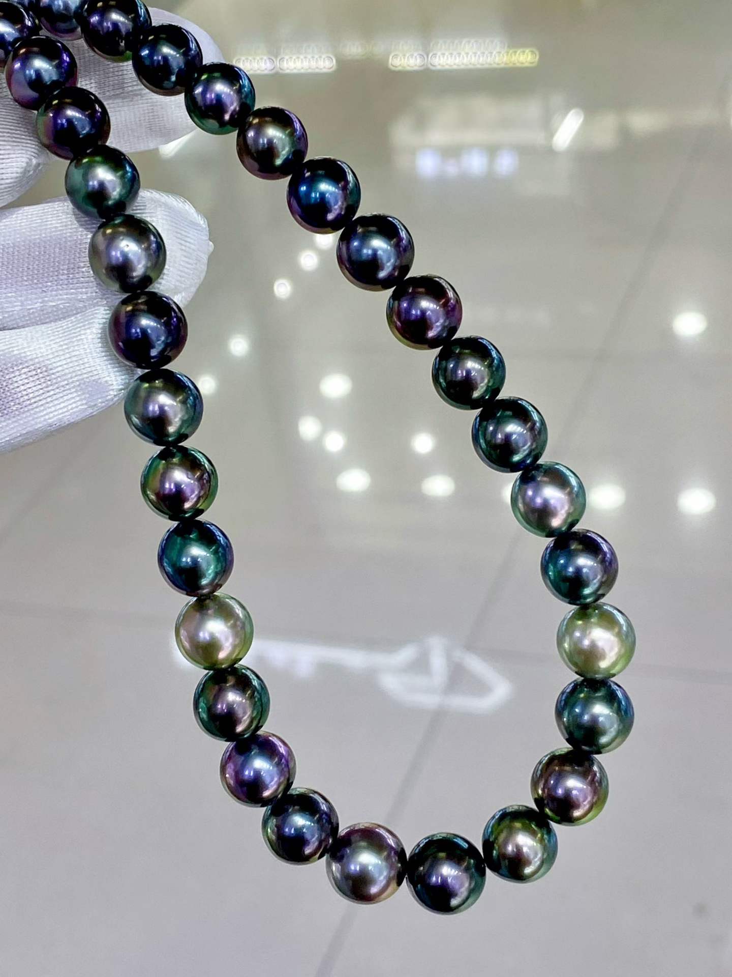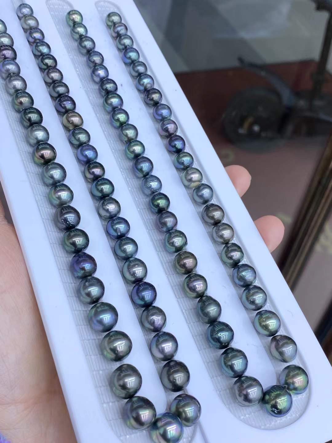Morandi-toned Tahitian pearls. 8-11mm, basically round and flawless, with perfectly graduated mixed tones in a rich peacock-green necklace. Only large wholesale lots can produce a specially selected strand this complete.