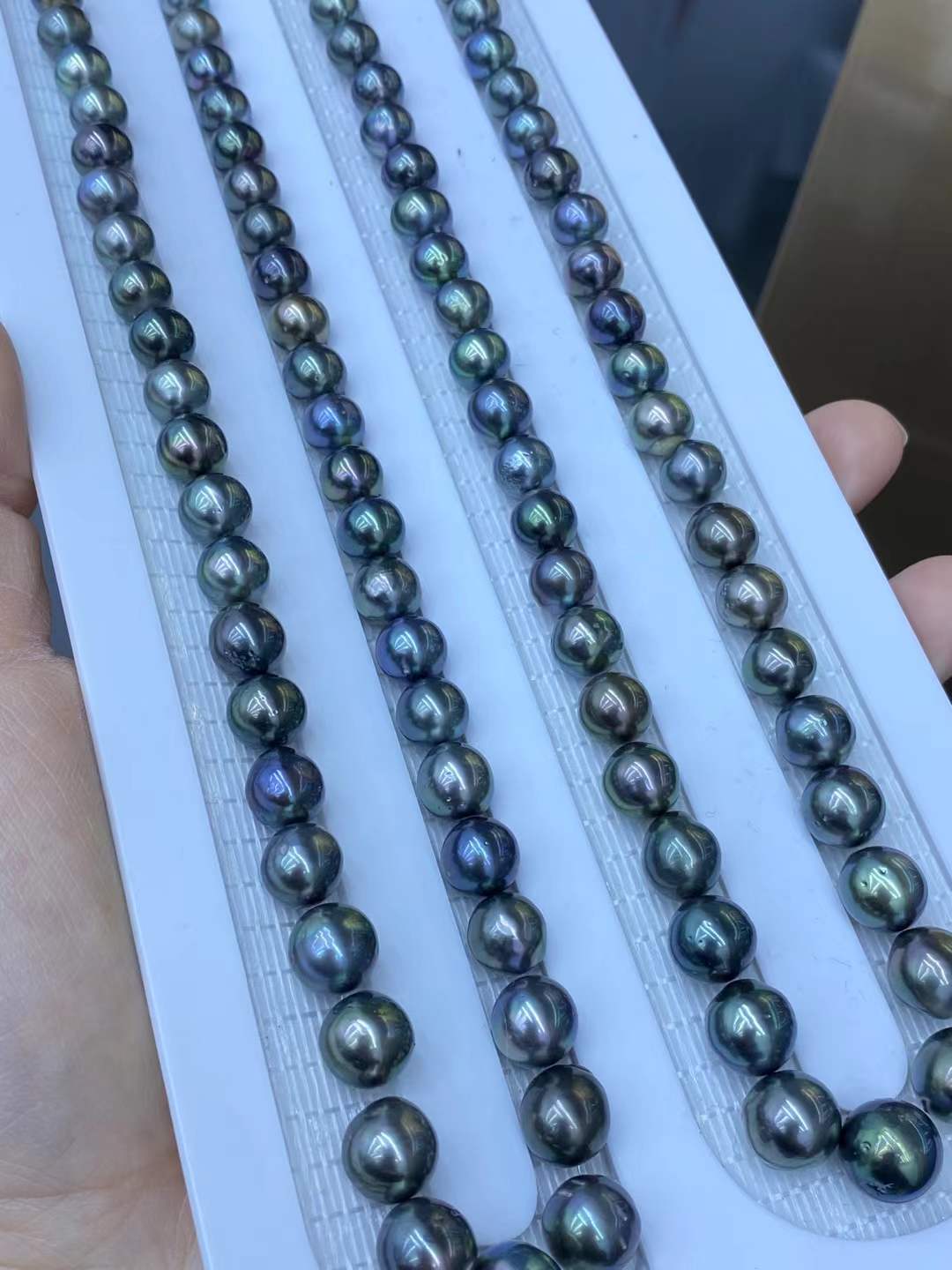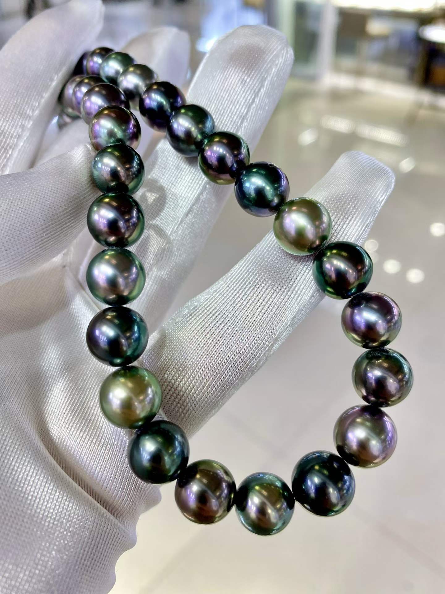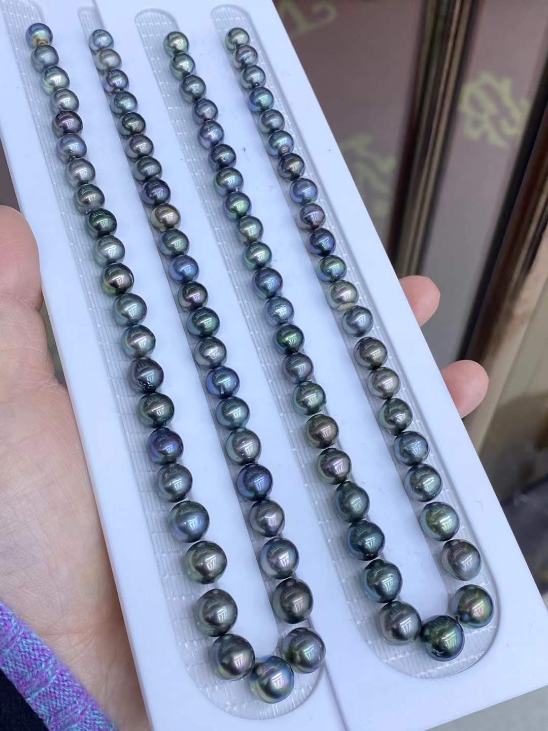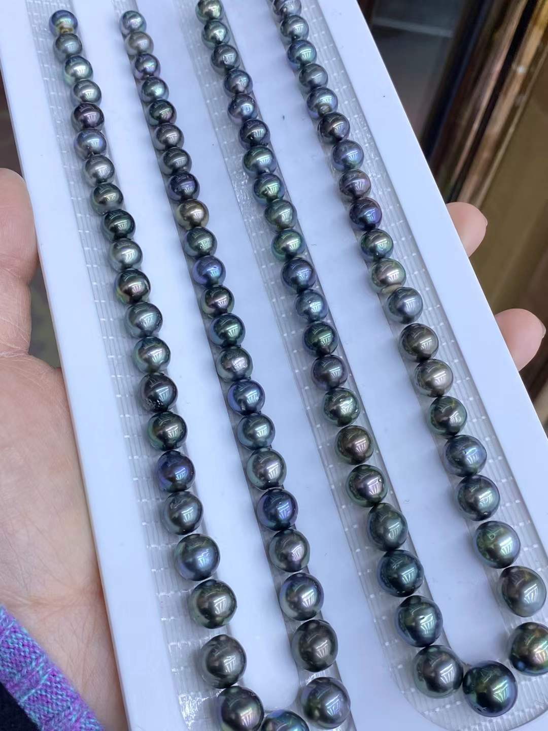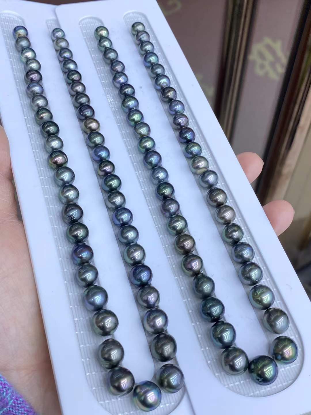 Morandi-toned Tahitian pearls. 8-11mm, basically round and flawless, with perfectly graduated mixed tones in a rich peacock-green necklace. Only large wholesale lots can produce a specially selected strand this complete.