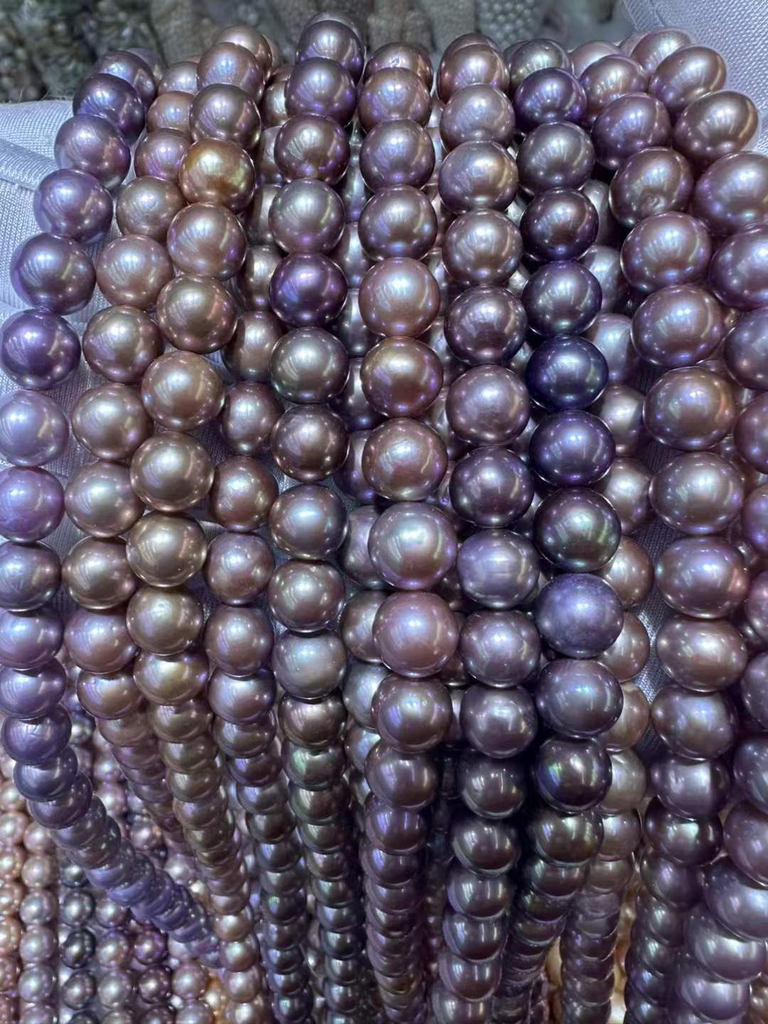 11-12mm round Edison pearls in unusual tones, very very lightly blemished. High-quality Edisons with looks that rival — or even surpass — saltwater pearls.