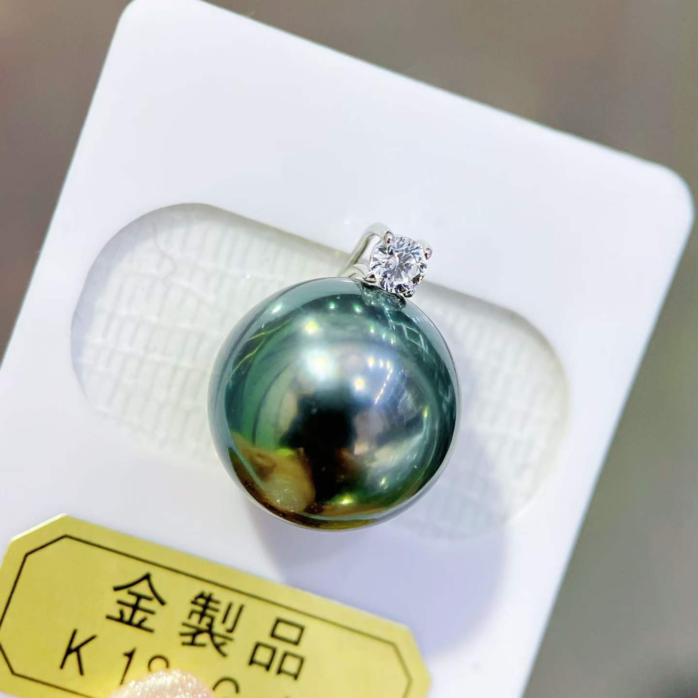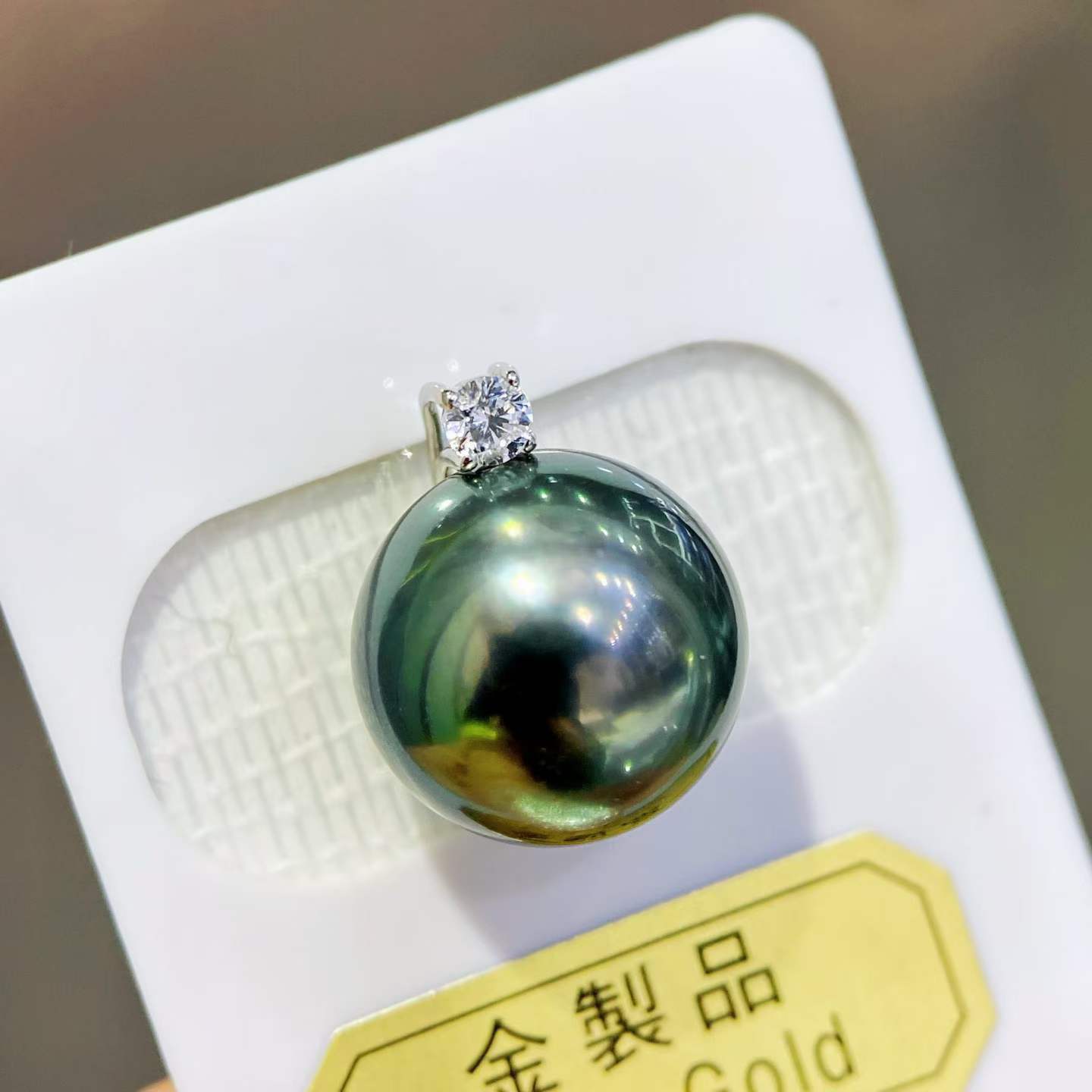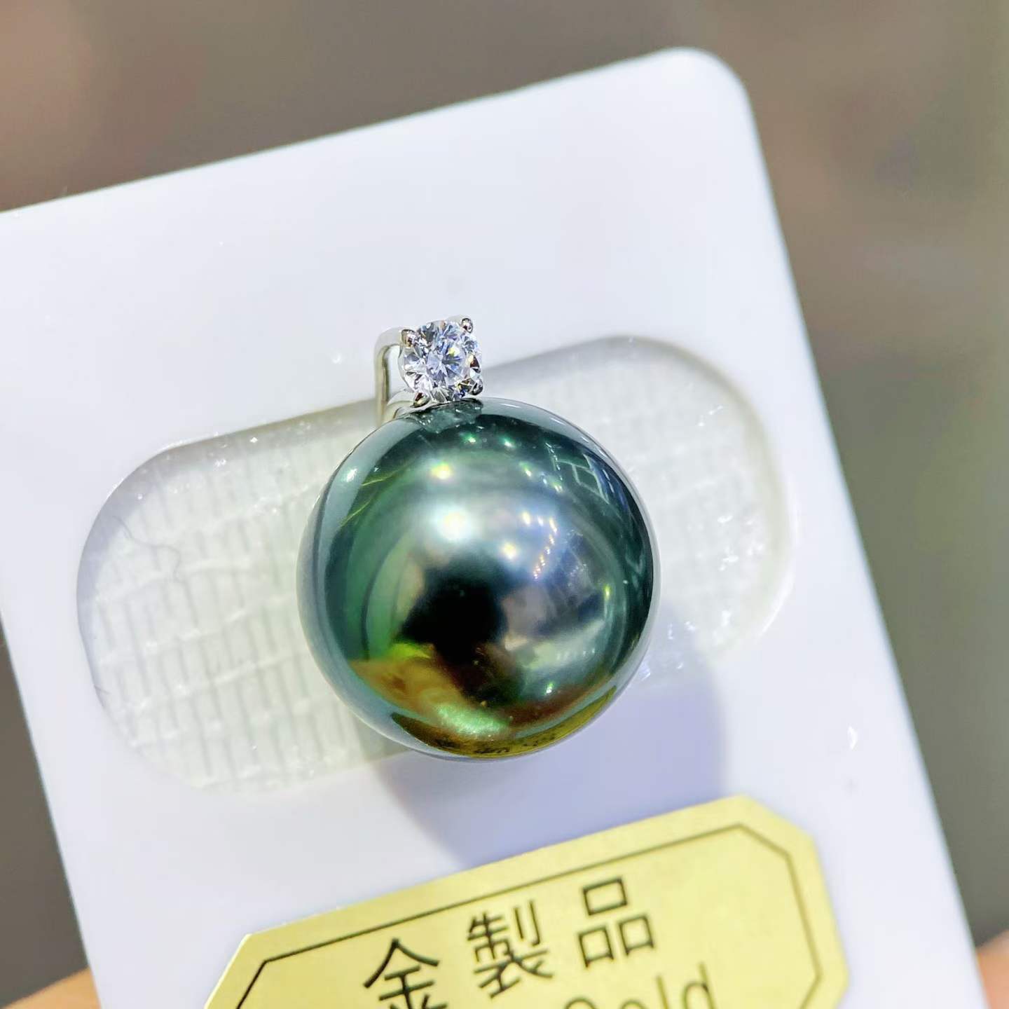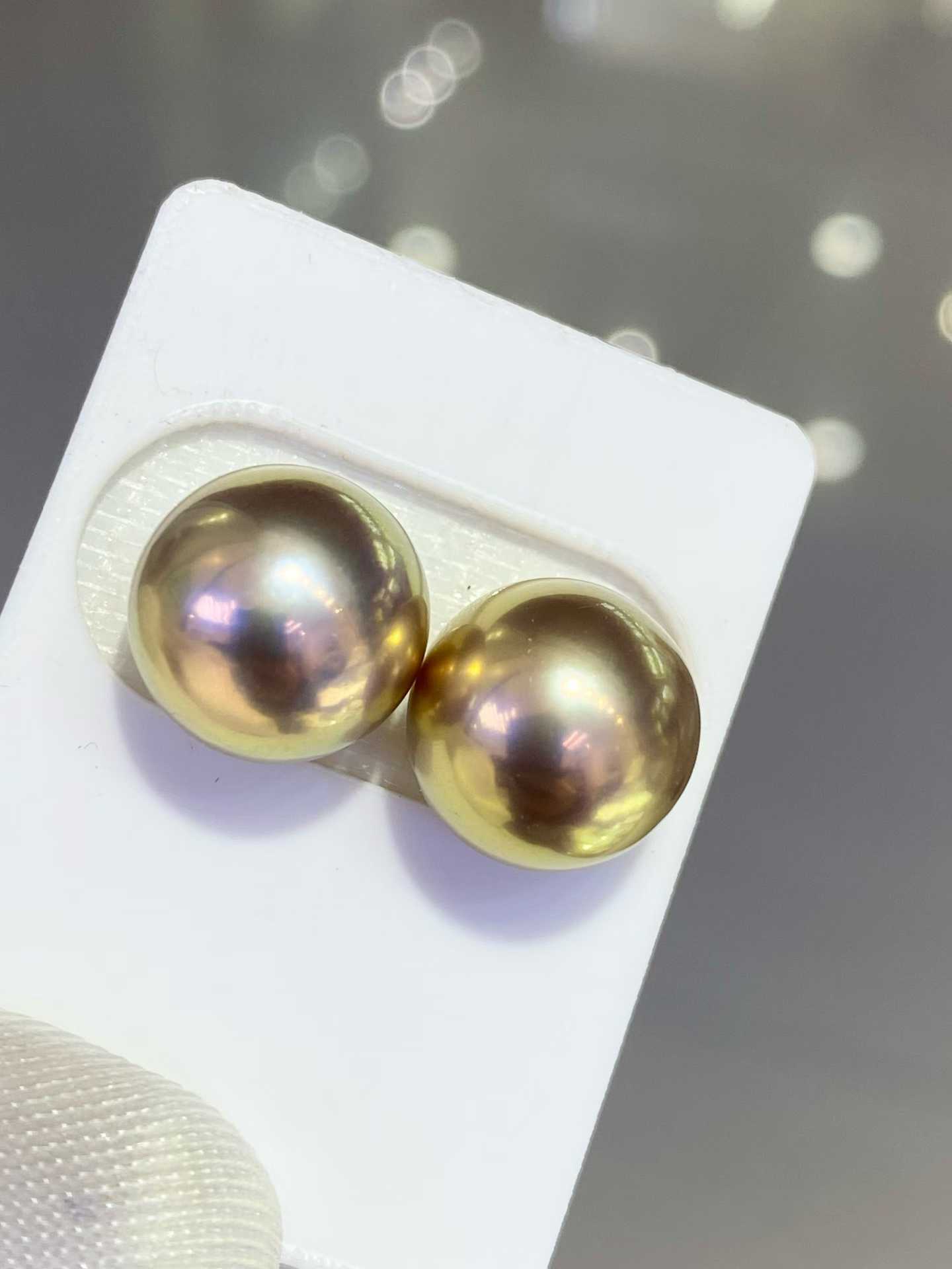 12mm round pearls with only extremely tiny blemishes, rich oily green shine, photographed in natural light, set in 18k gold. Ready stock, about $364.