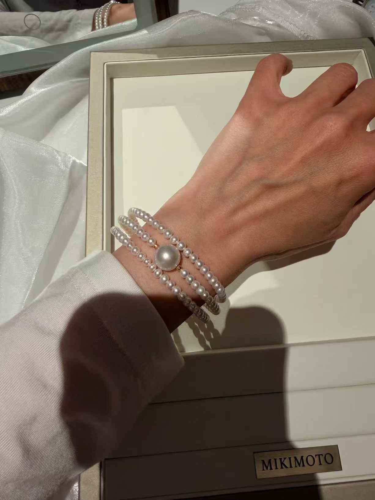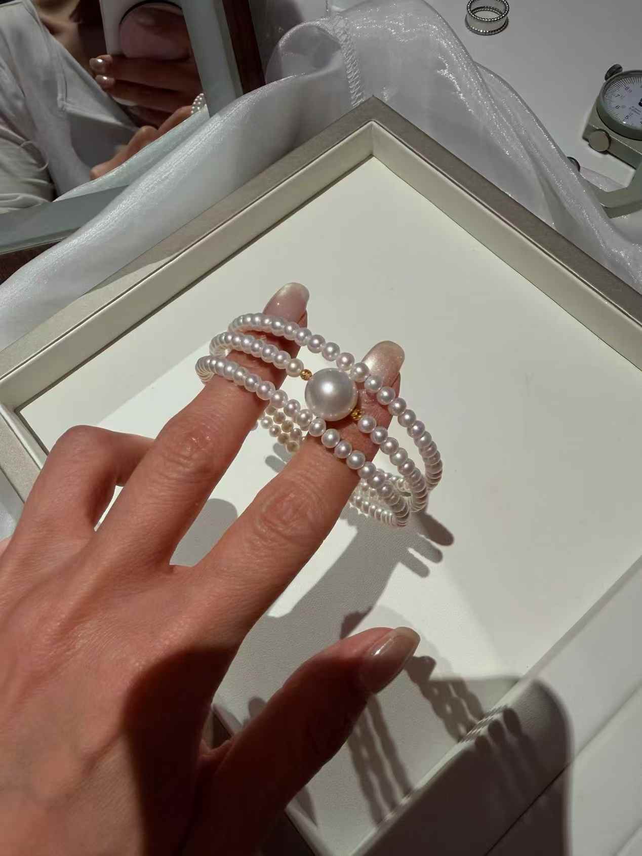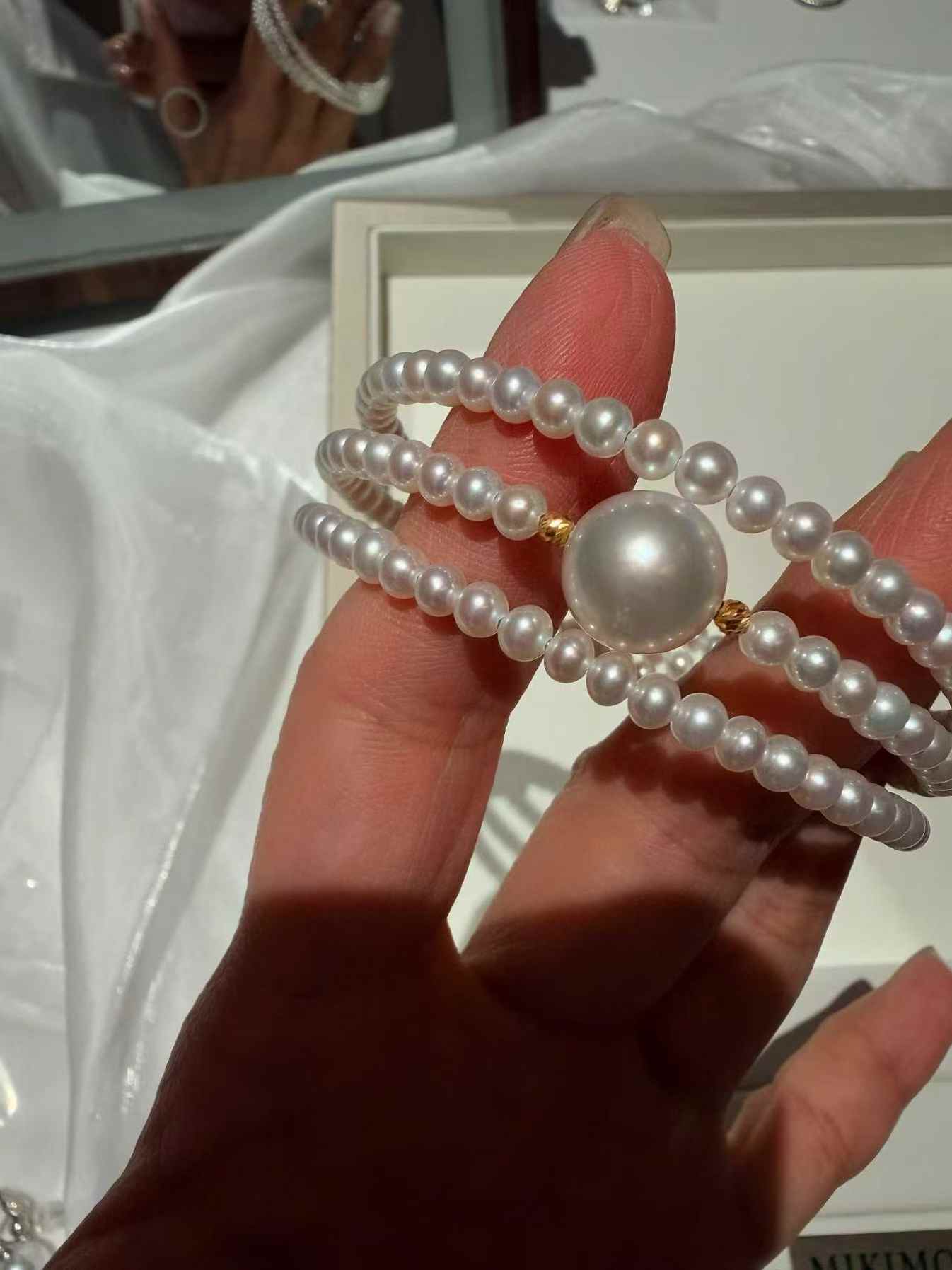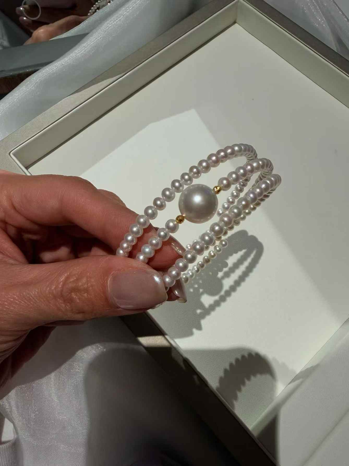 Designer triple-wrap bracelet — 11mm Edison pearl paired with 4-5mm aurora freshwater pearls, finished with two 18k gold beads and imported spring fittings. Fits wrist sizes over 15cm.