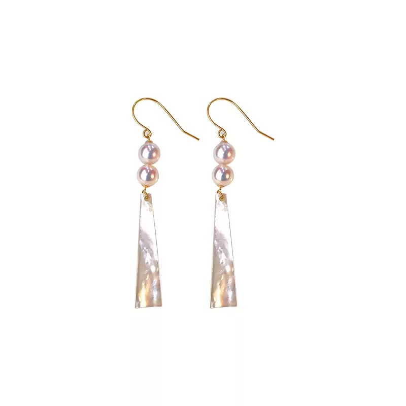 Akoya Pearl and Mother-of-Pearl Long Hook Earrings in 18K Gold, Hanadama-Grade, Elegant Style