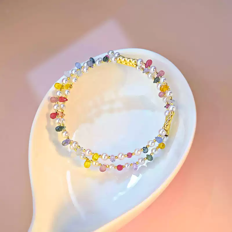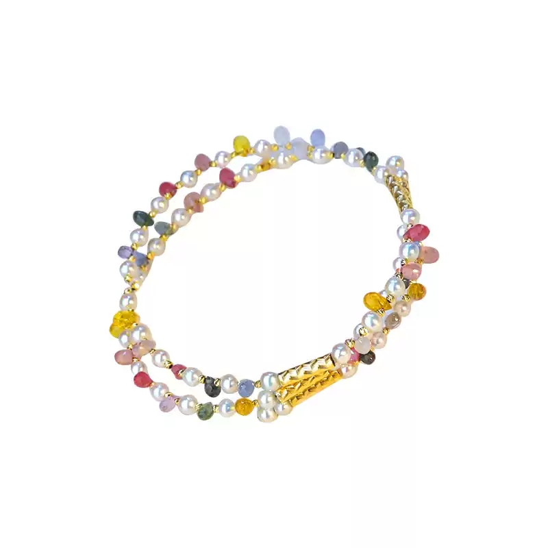 Akoya Pearl Bracelet with Candy-Color Gemstones, 18K Gold, Two-Way Bracelet and Necklace Design