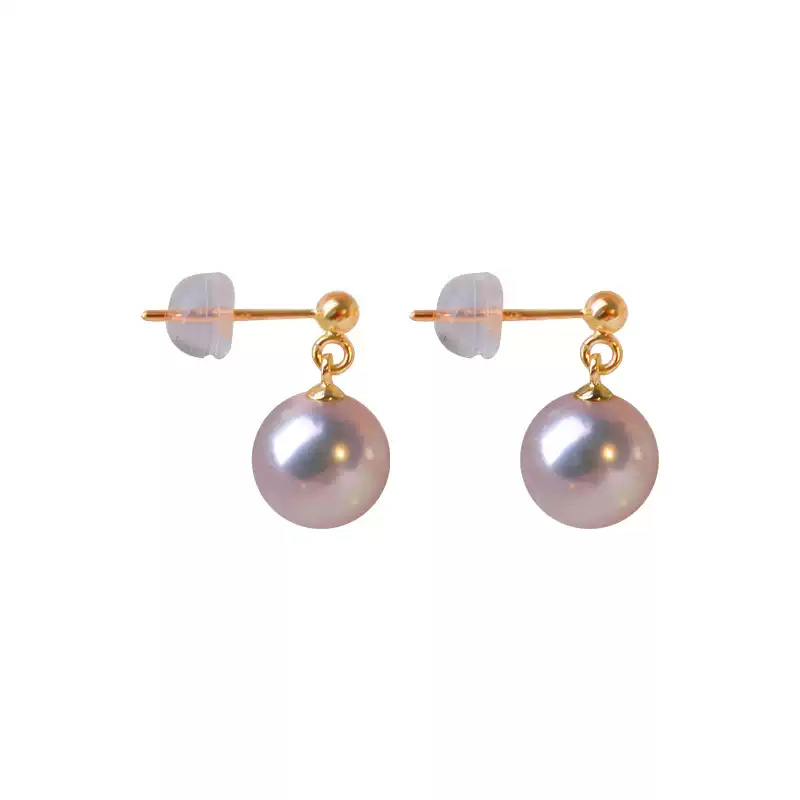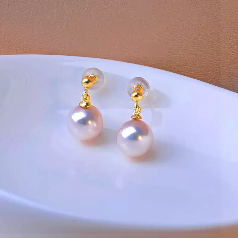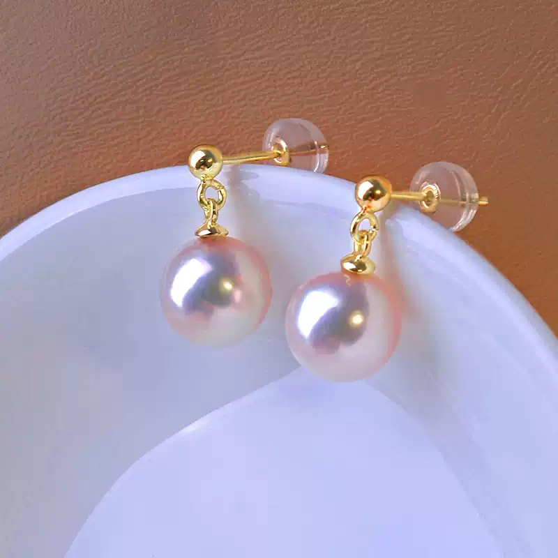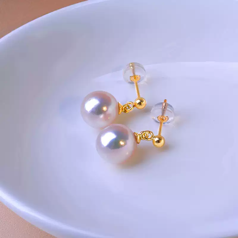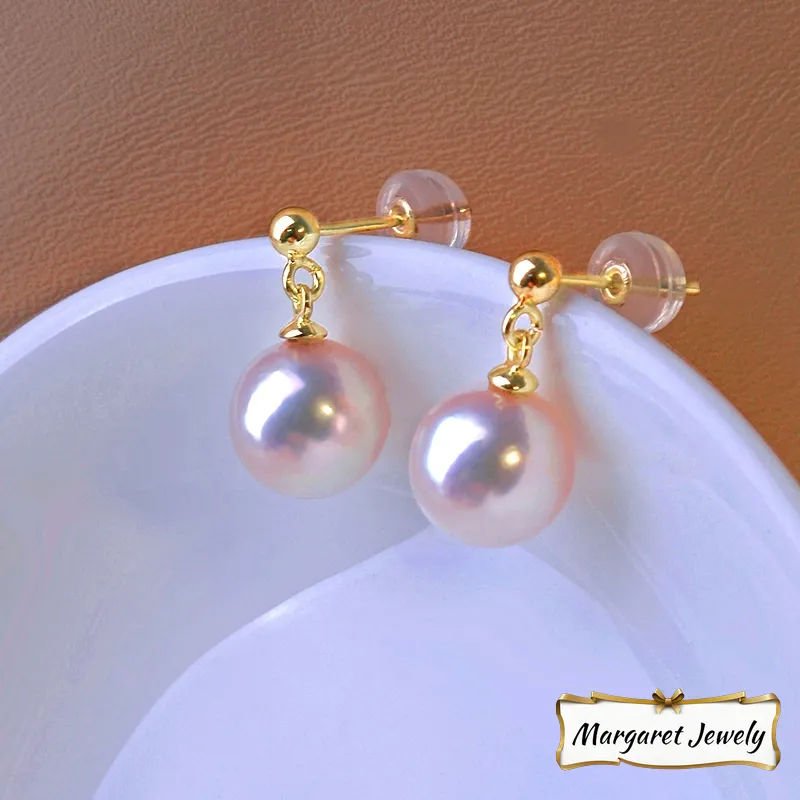Akoya Pearl Drop Earrings in 18K Gold, Round Hanadama Pearls with Excellent Luster
