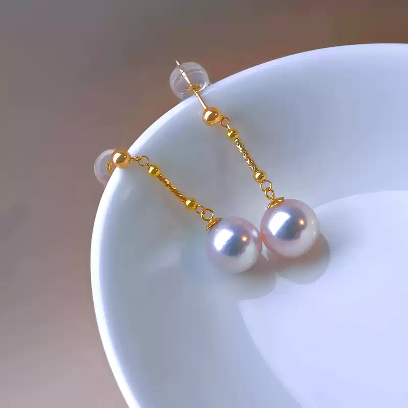 Akoya Pearl Drop Earrings in 18K Gold with Textured Detailing, Hanadama-Grade, Excellent Luster